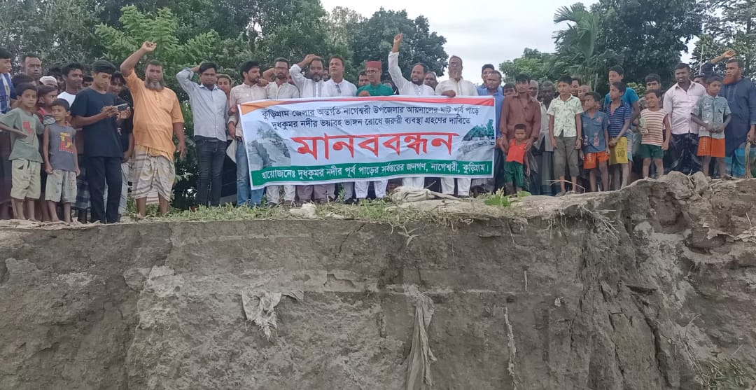 এই দুঃসহ বাস্তবতার প্রতিকার চেয়ে রবিবার (২৪ আগস্ট) বিকেল ৫টায় দুধ কুমর নদীর তীরে মানববন্ধনে দাঁড়ান ভাঙনকবলিত মানুষজন। হাত ধরে একে অপরের সঙ্গে জোট বাঁধেন নারী, পুরুষ, শিশু, বৃদ্ধ—সবার চোখেমুখে আতঙ্ক আর অনিশ্চয়তার ছাপ।