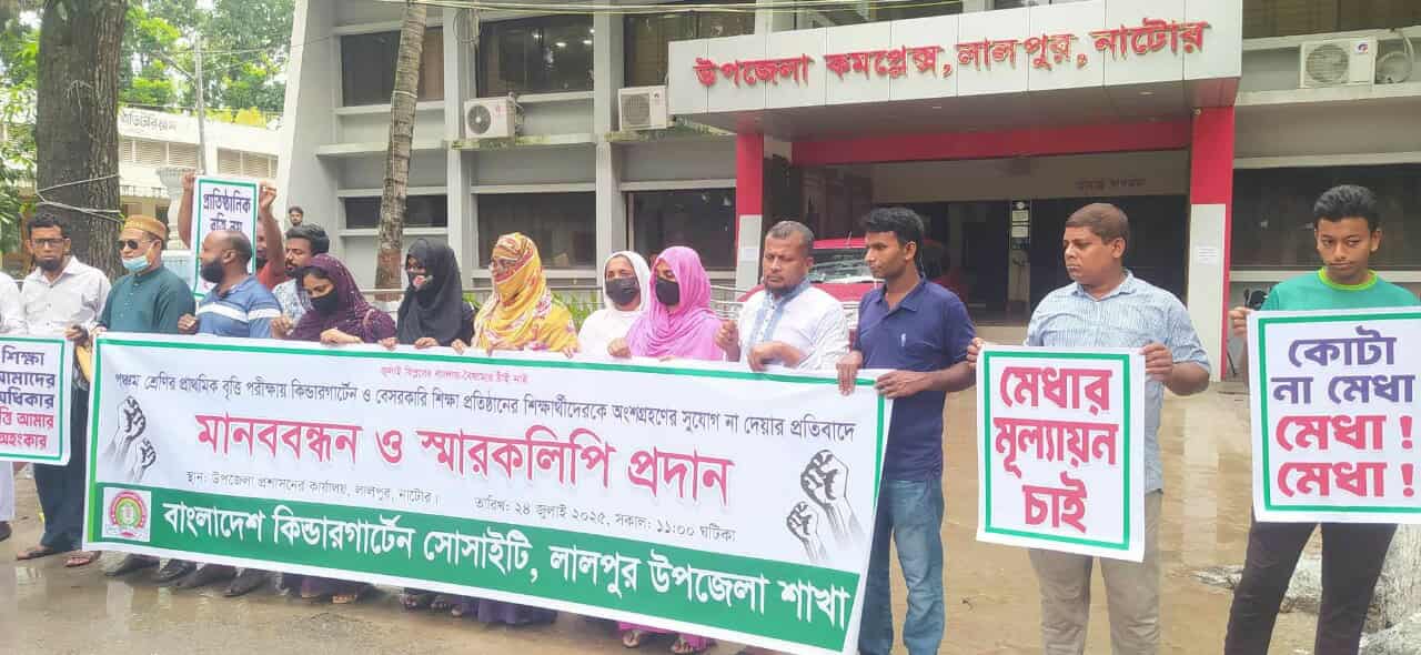 সরকারি প্রাথমিক বৃত্তি পরীক্ষায় কিন্ডারগার্টেন শিক্ষার্থীদের অংশগ্রহণের সুযোগ না রাখার সিদ্ধান্তের প্রতিবাদে নাটোরের লালপুরে মানববন্ধন কর্মসূচি পালন করেছে বাংলাদেশ কিন্ডারগার্টেন সোসাইটি, লালপুর শাখা।